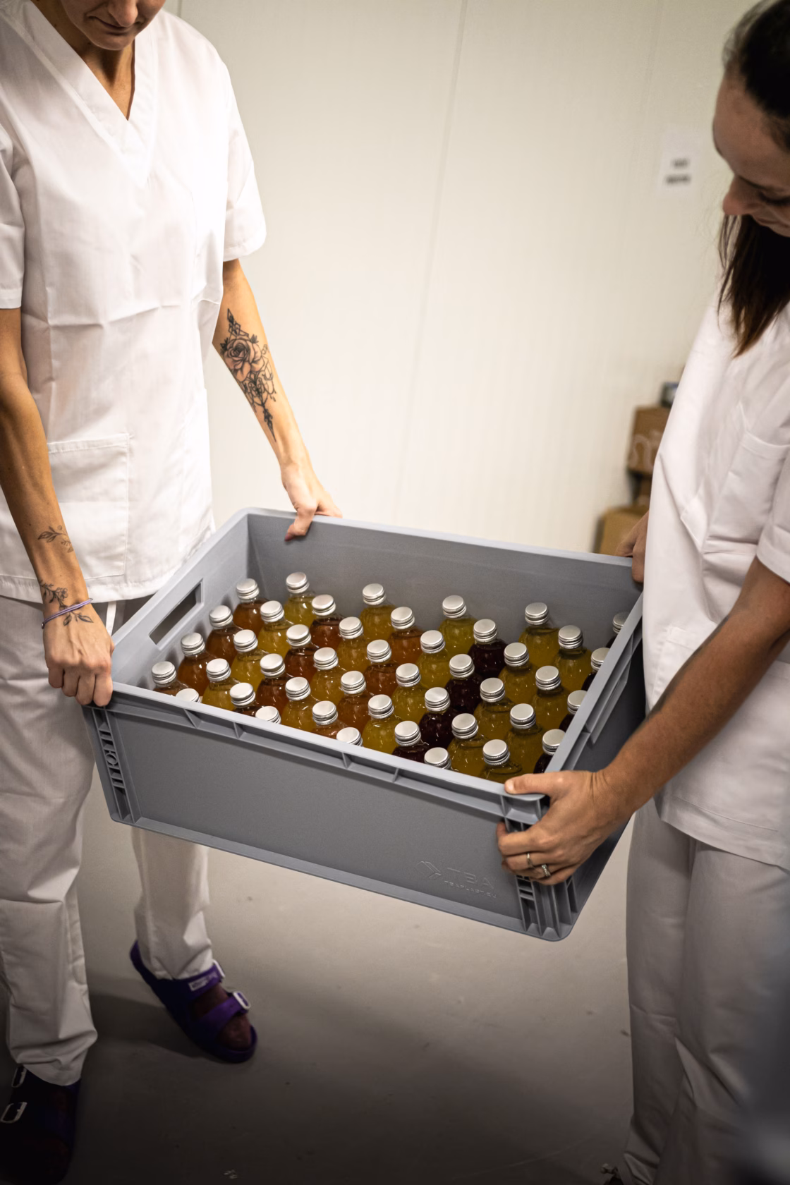 Na dochutenie používame len skutočné ovocie a bylinky, žiadne arómy či koncentráty. Každá príchuť je výsledkom našich vlastných receptúr – miešame ju vo vlastnom laboratóriu tak, aby vznikla vyvážená kombinácia sviežosti, kyslosti a prirodzenej sladkosti.